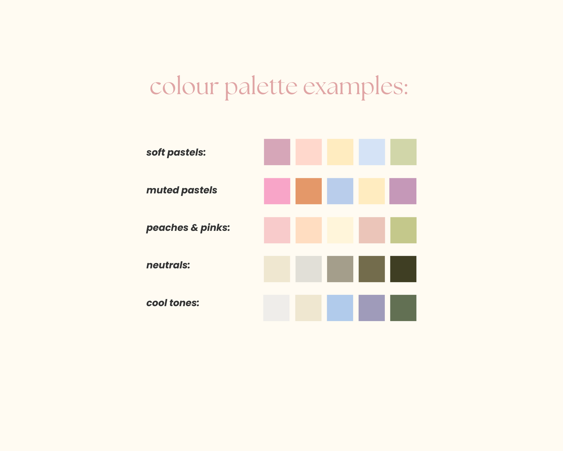 - Peaches & Pink: Soft pink, blush, peach, cream.