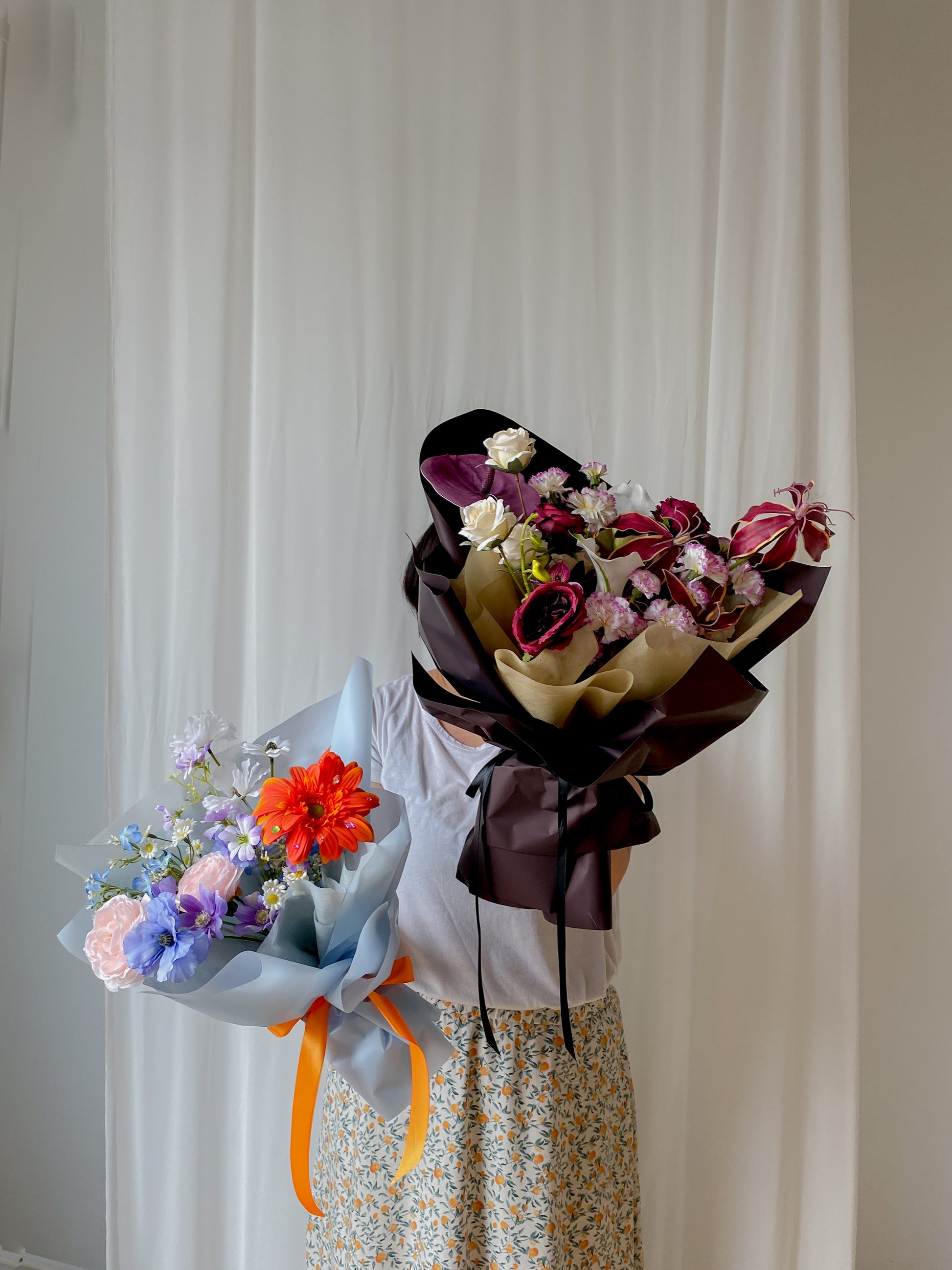 Our bouquets are made with high-quality artificial flowers and last forever with proper care. Artificial flowers are easy to care for and require minimal maintenance. Simply clean them regularly with water to keep them dust-free, and avoid storing them in direct sunlight or near radiators to maintain their optimal condition.